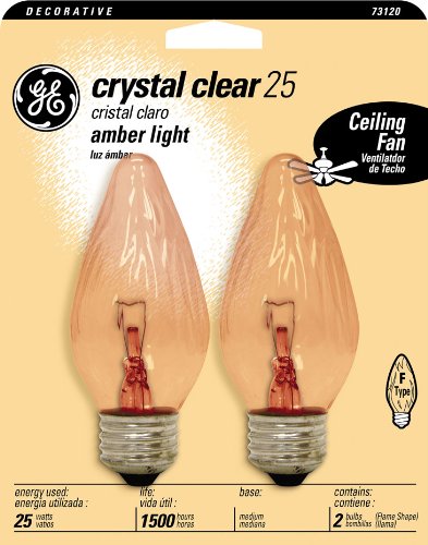Product Descriptionp/pGeneral Electric 73120 2 Count 25 Watt F Type Amber Light Bulb, ClearGeneral Electric 73120 2 Count 25 Watt F Type Amber Light Bulb, Clear Features:; 1500 life hours; Medium base size; 25 Watts; Amber; Flame shape bulb; Ideal for use in ceiling fans; 2 per pack; Also Known As: GE 73120