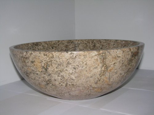 Gorgeous Fossil Marble Sink in 14 inch Diameter. Just the perfect size for the Powderroom or any small bathroom. Please wait until you receive the sinks to make holes in your vanitytop because these sinks are hand-carved and can slightly vary from given dimensions. Marble is a product of nature, every sink is beautiful with its own pattern of marbling.
