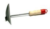 The blade is made from hardened steel. The wood handle has a plastic cap that includes a hanging loop so that the tool can be easily stored.